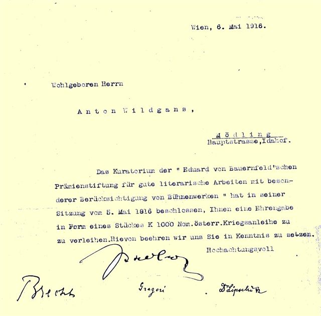 1916-05-06, Preis der Eduard Bauernfeld Prämienstiftung für Anton Wildgans