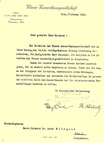 1922-01-17, Ehrenmitgliedschaft der Wiener Konzerthausgesellschaft für Anton Wildgans