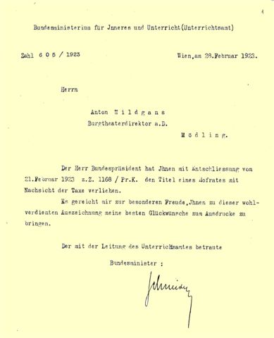1923-02-21, Hofratstitel für Anton Wildgans