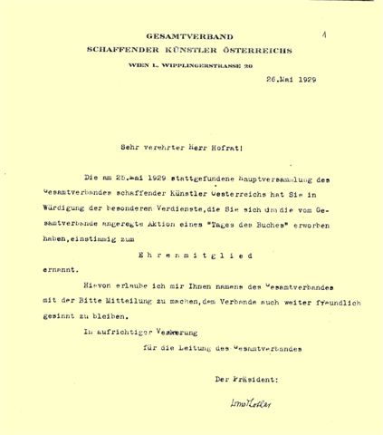 1929-05-26, Ehrenmitgliedschaft im Gesamtverband der schaffenden Künstler Österreichs für Anton Wildgans